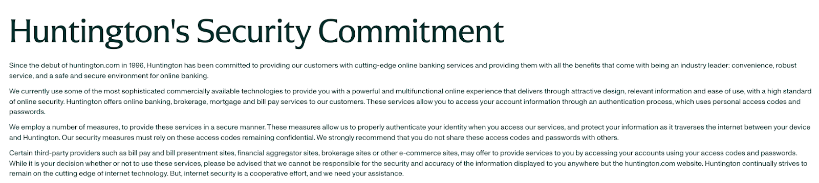 For example, Huntington Bank has a Privacy and Security Center that discusses its commitment to security and provides tips to users on how to protect themselves from fraud.