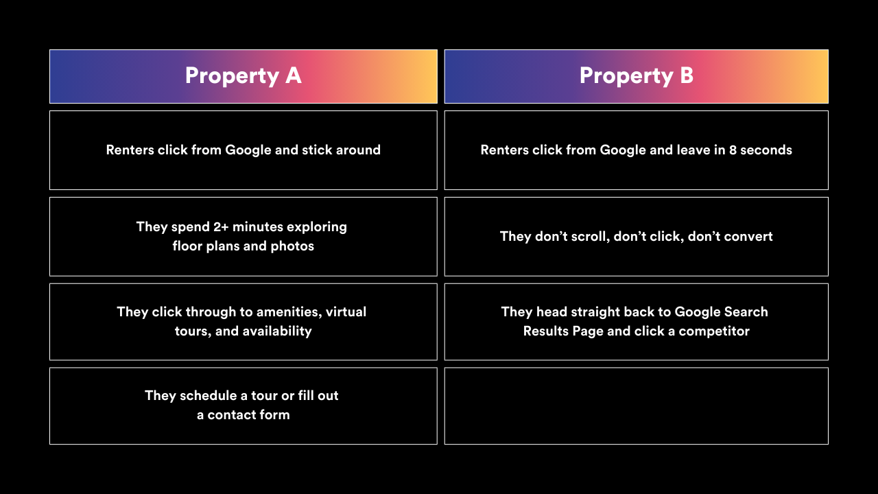 Here’s something a lot of property managers don’t realize: more traffic does not automatically mean better rankings. Google isn’t just counting clicks. It’s watching what happens after the click.